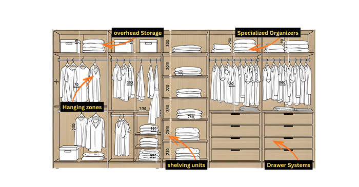 Current trends include floor-to-ceiling designs, sleek handle-less shutters, integrated LED lighting, dedicated sections for accessories and jewellery, glass-fronted display units, and smart interiors with pull-out trouser presses and tie racks.