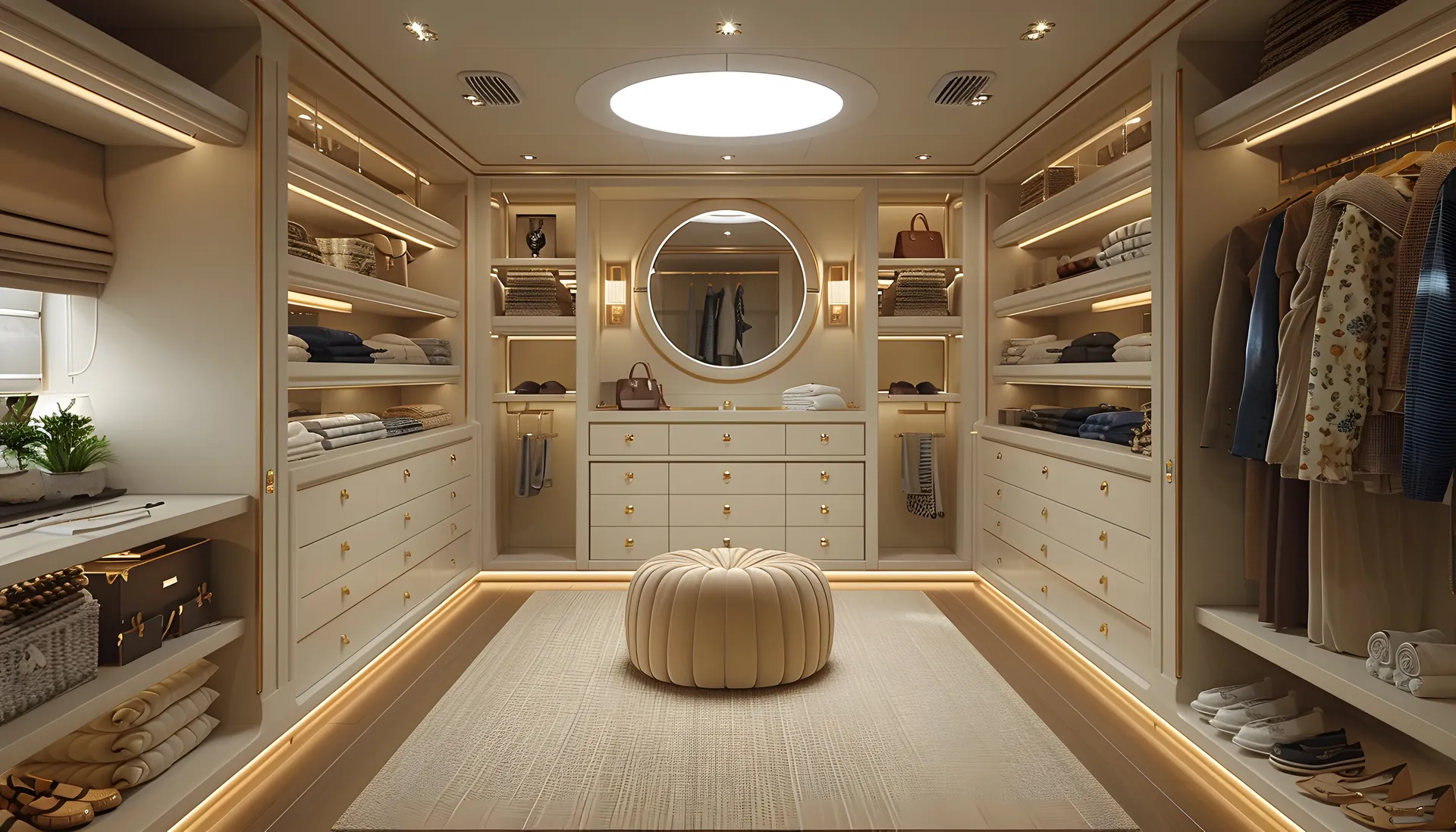 - Dedicated dressing space with mirrors and seating.